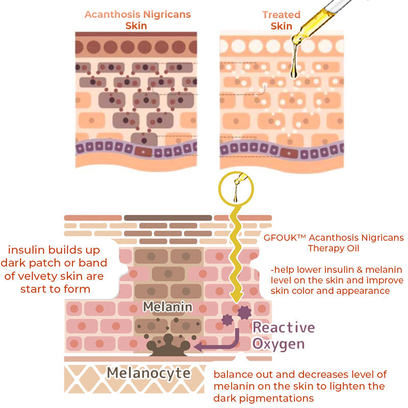 GFOUK™ Acanthosis Nigricans Therapy Oil effectively addresses the primary reason of increased melanin that leads to deepening skin pigmentation by speeding up the clearance of insulin from the blood. The oil stimulates to release glucose that has been held there, which can assist to quickly flush insulin from the circulation.