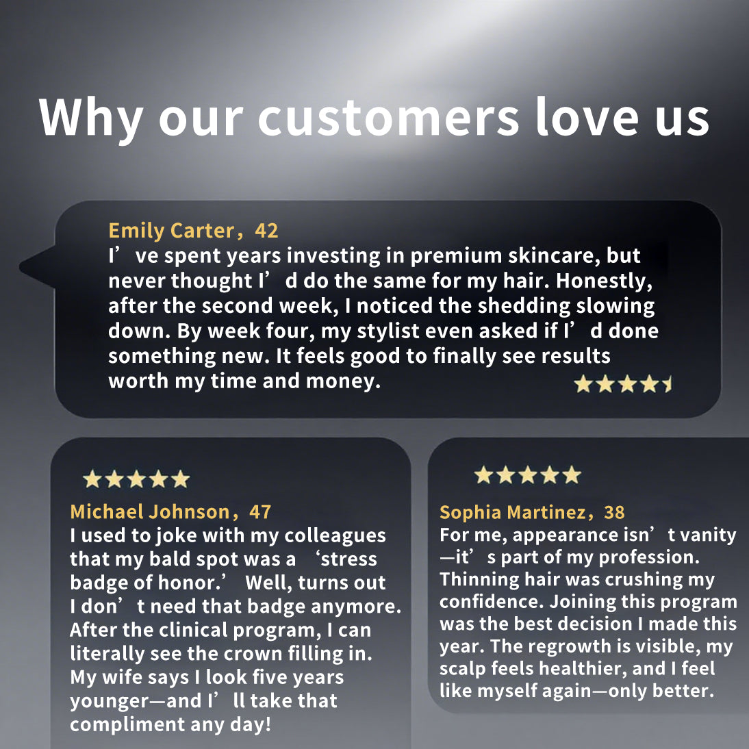 “My stressful schedule gave me a shiny bare spot at my crown—felt like my scalp had its own spotlight! Three weeks into the trial, new hairs started filling in. Now I can actually focus on work without obsessively checking the mirror… though I do sneak a peek sometimes, just to admire my regrowth!”