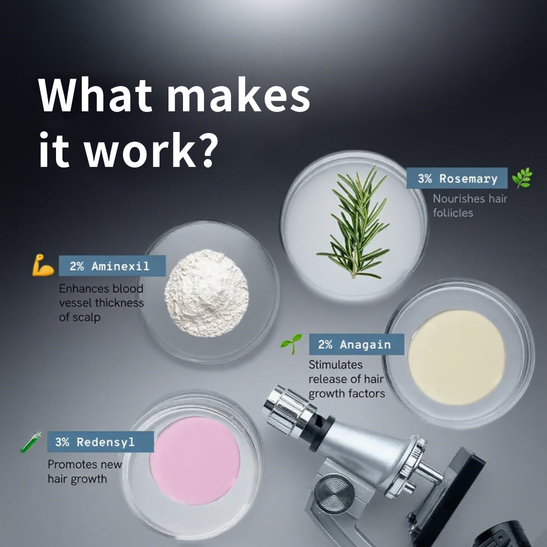 Stimulates follicle stem cells to wake up dormant follicles. Clinical studies show up to 86% of inactive follicles reactivate in 12 weeks.