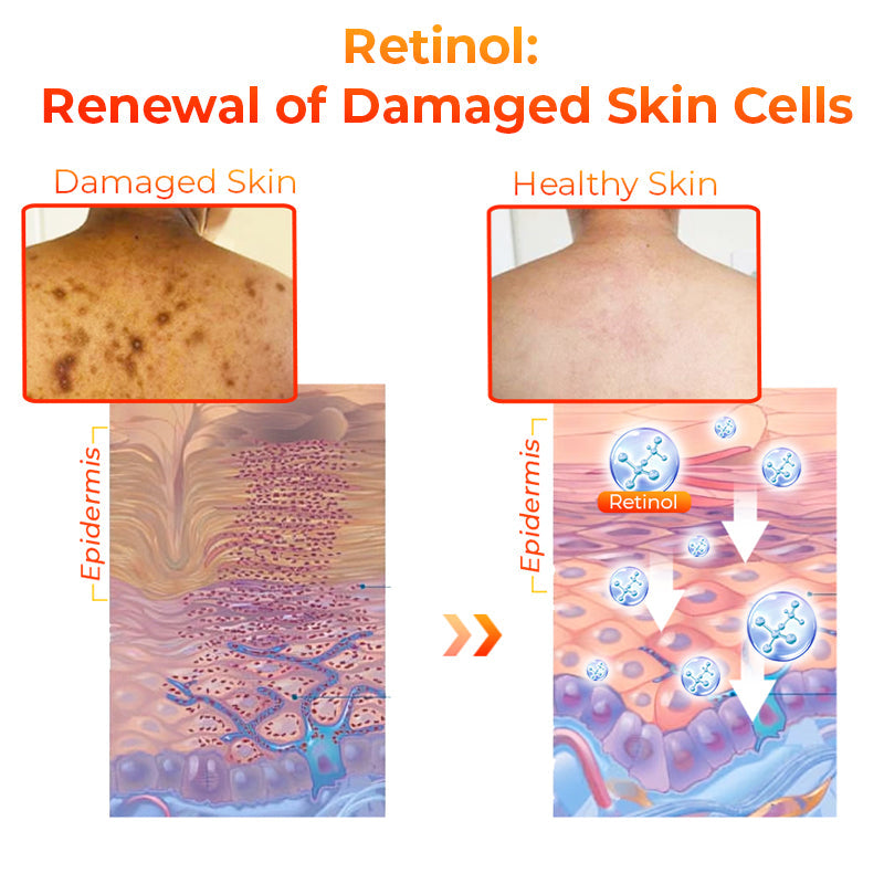 Retinol, a vitamin A derivative, is renowned for its capacity to induce cell turnover, which facilitates the production of new, healthier cells and the elimination of decaying skin cells. This procedure not only enhances skin texture but also facilitates the gradual reduction of hyperpigmentation and dark blotches. Retinol enhances the skin-lightening properties of kojic acid by expediting the turnover of pigmented skin cells, which expedites the disappearance of dark blotches and achieves a more uniform skin tone. It also enhances the skin's overall health and resilience, rendering it more resilient to environmental stressors.