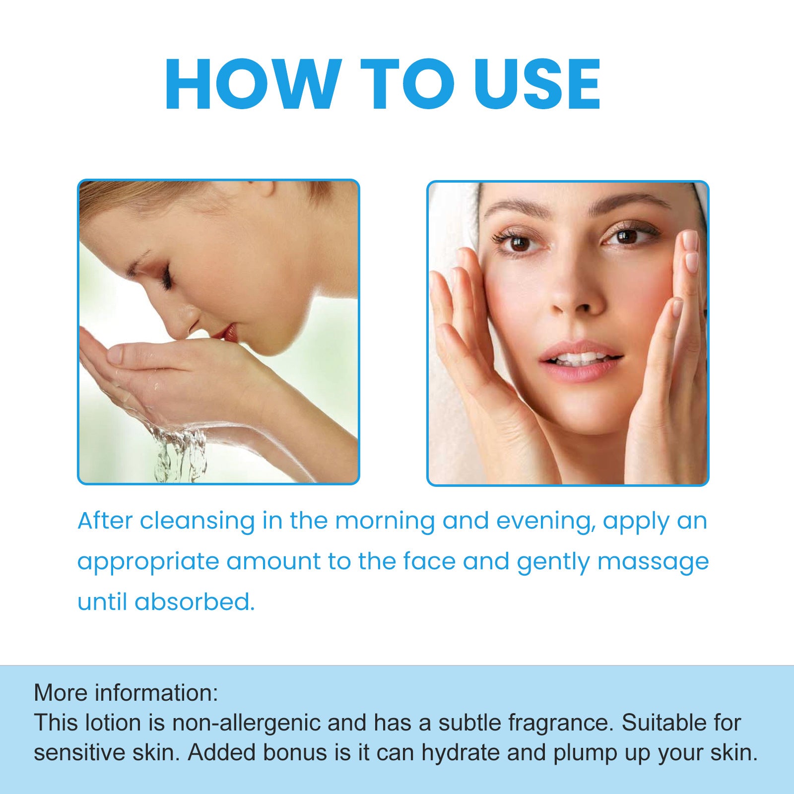 Breng elke ochtend en avond 3-4 druppels van deze lotion aan op gezicht en hals.