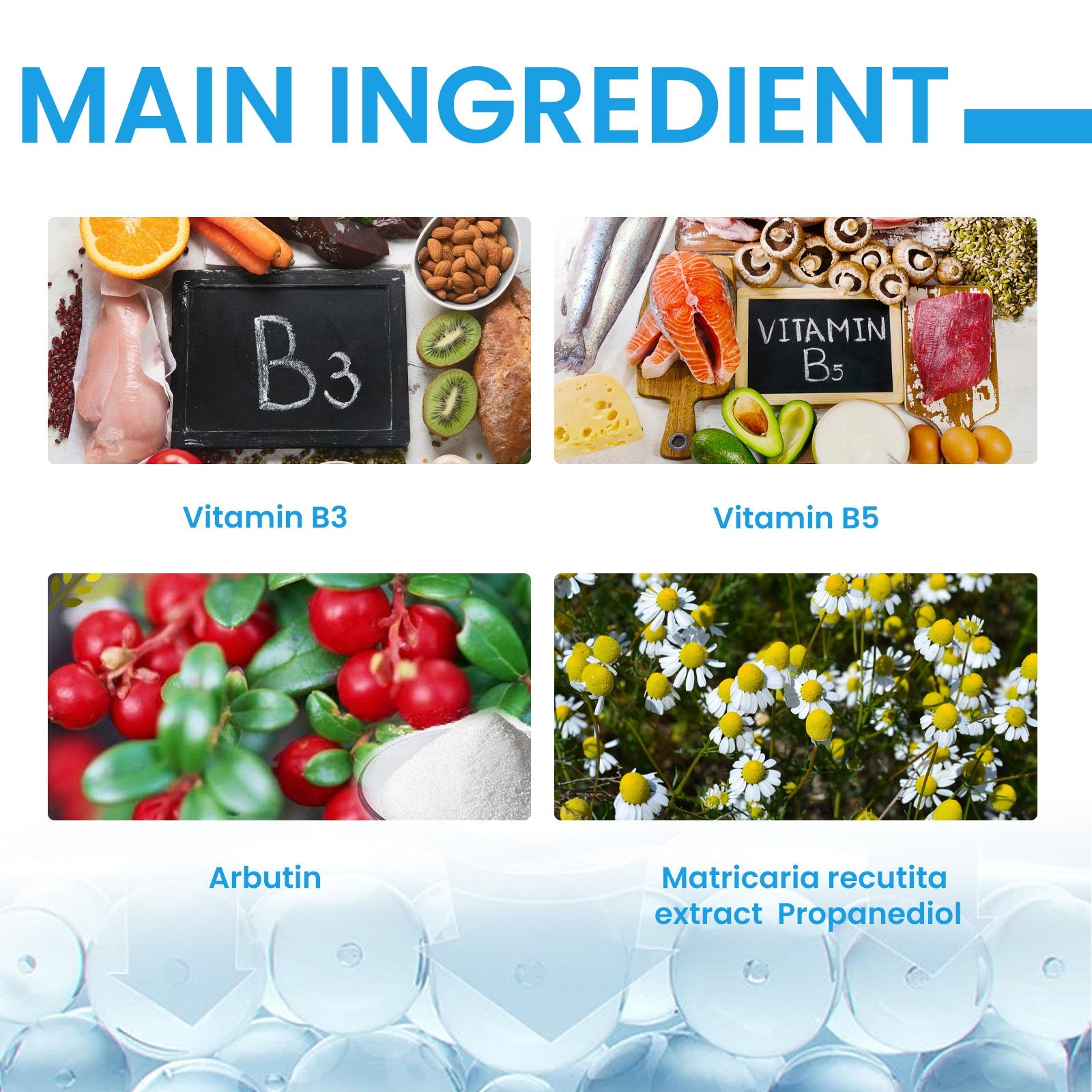 Matricaria recutita-extract: Bevat flavonoïden, aminozuren en andere ingrediënten, waardoor het de stofwisseling in de opperhuid en de hoornlaag van de huid kan reguleren. Het wordt gebruikt als voedingsadditief in dit serum om een ruwe huid te voorkomen, de opperhuid slijmvliezen te beschermen tegen bacteriën en het evenwicht tussen vocht en olie in de huid te reguleren.