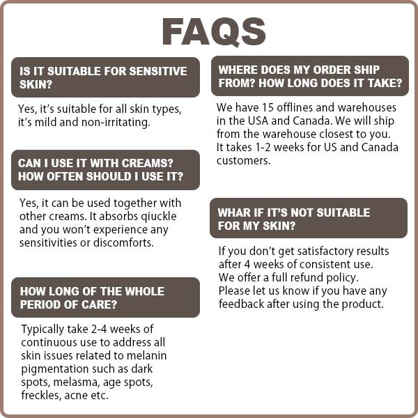 The dark spot removal peeling oil also assists in encouraging a healthy collagen production in the body. It acts to smoothen and bring back the skin’s natural elasticity while simultaneously reinforcing its protection against environmental stressors. Preventing sun damages and premature age spots which is also one of the triggers in hyperpigmentation. This fine product is safe for daily use for all skin types and it offers pain-free peeling actions to avoid irritation, redness and discomfort. What’s more? It is applicable for face and different body parts, including underarms, bikini areas, elbows, knees, feet, hands, inner thigh, neck and other darkened areas that need treatment. Achieved a smoother and healthier porcelain-like brightened skin in only 3 weeks of regular correct usage!