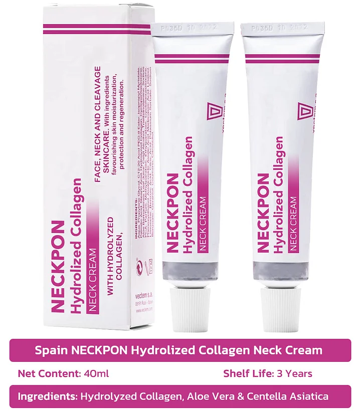 Spain NECKPON Hydrolized Collagen Neck Cream was launched for skin's moisturizing and rejuvenating effects, it is mainly used to delay skin ageing, improve natural moisturizing and help to prevent and reduce the appearance of wrinkles, so that everyone can have beautiful youthful skin. The cream contains hydrolyzed collagen, which is a form of collagen that has been broken down into smaller fragments for better absorption by the skin.