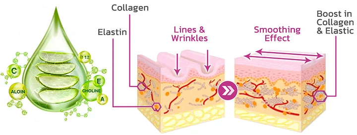 Aloe vera extract aids in the body's natural increase in collagen formation, which further aids in minimizing the appearance of wrinkles and other telltale indications of aging. Sterols are molecules found in aloe vera. These sterols encourage the synthesis of hyaluronic acid and collagen, which aid in the skin's ability to retain moisture.